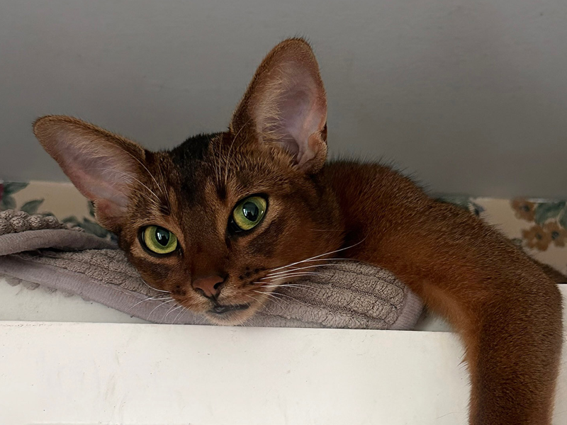 “Maggie” is a very sweet, gorgeous cinnamon girl. She is elegant and has a wonderful, rich cinnamon colour with outstanding ticking. Maggie is very loving and quiet. She would rather sit and observe the other cats’ antics than participate in the games.